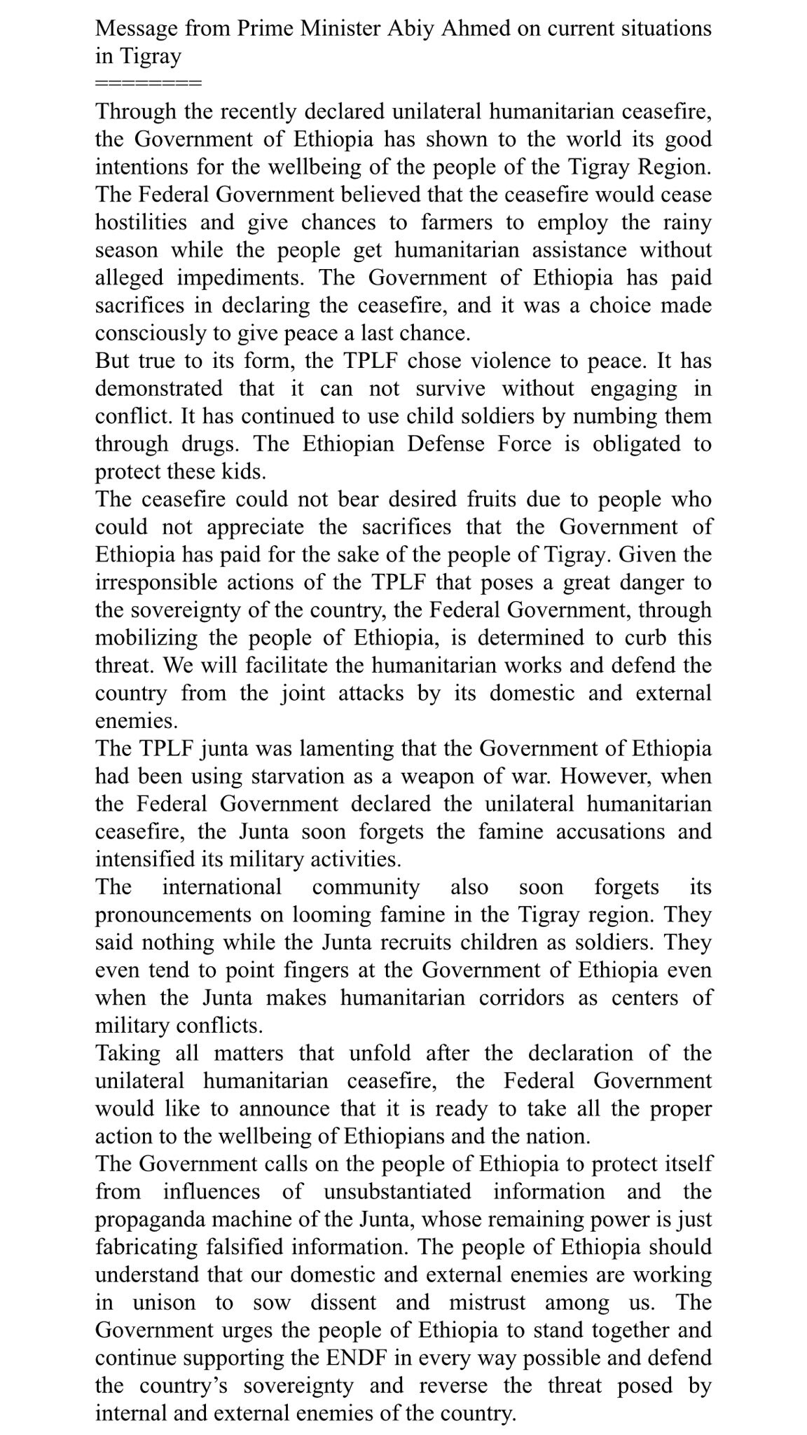 After their remaining brigades fled from the Tigrayan capital Mekelle, the Ethiopian foreign ministry announced a ceasefire. This would be comic were it not so tragic. Ethiopia doesn’t have any troops in Tigray who can fire any shots. Most of the statement is instructing imaginary government departments to carry out activities in places where they have no presence. The announcement had a sinister ring because it said that the ceasefire was to allow farmers to cultivate — indicating that when the farming season is over in three months’ time, the ceasefire will lapse. Abiy’s ministers are on an arms-shopping spree and have said they intend to reoccupy Tigray at that time.