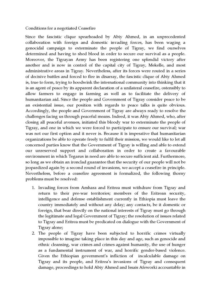 Most important, a ceasefire should be a step towards political negotiations aiming for peace. Often, a ceasefire agreement includes a commitment to ending hostile rhetoric. That isn’t happening. The Ethiopian statement indicates the opposite intent. It refers to the Tigrayan political leaders as “the criminal clique.” Reda routinely describes the government as “fascist.”