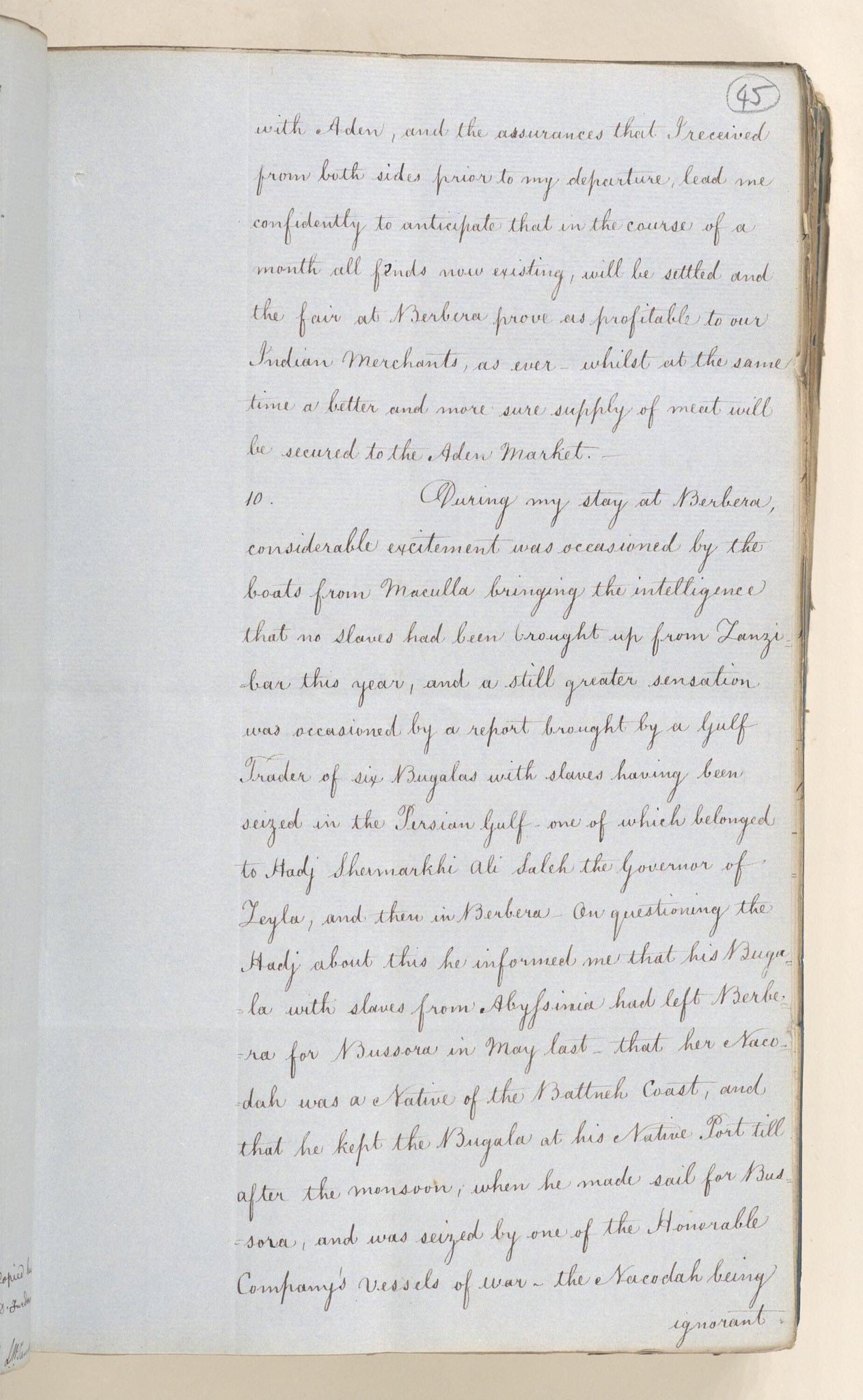 A ship containing slaves from Abyssinia belonging to Haji Sharmarke captained by his Omani Nakhuda en route to Basra Iraq was seized by the British Honourable Company Vessels of War, enforcing their ban on the slave trade on the Red Sea [1848]