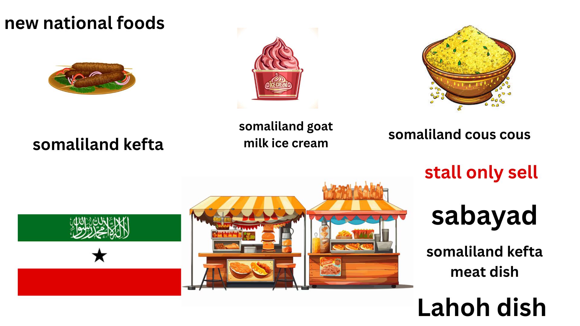 somaliland has many dishes such as rice and meat and spagetti and meat , and cured meats , somaliland may not have enough national foods , and can make thier own variations , such as stalls that sell foods to torusits that are somaliland food , say selling lahoh in streets for 1 dollar with sweet such as banana and suger with paper wrap , somaliland should control the food and make new national foods , a somali kefta made of meat that is morrocan kofta from turkey , and sell in stalls in somaliland , how somaliland controls food stalls in hargesia and other cities is important , for torusim and for the country , it should show what the national foods are and the types of meals that would sell for tourists , somaliland should pick 10 foods that cultrally somaliland and 3 foods that sold in stall as food for torusit and peoples it can be European such as kefta , ie kofta , somaliland does have alot of meat so a meat dish , a vegatarian dish and a sweet dish could be sold , national foods are very cultural , and needs more available for torusits ,and for the somaliland population . Somaliand could change and eat cous cous only and leave rice and pasta behind , carob a food from ancient Egypt still eaten in sudan could be grown in somaliland as a sweet dish with lahoh , carob can be sold with ice cream , a chocolate alternative
