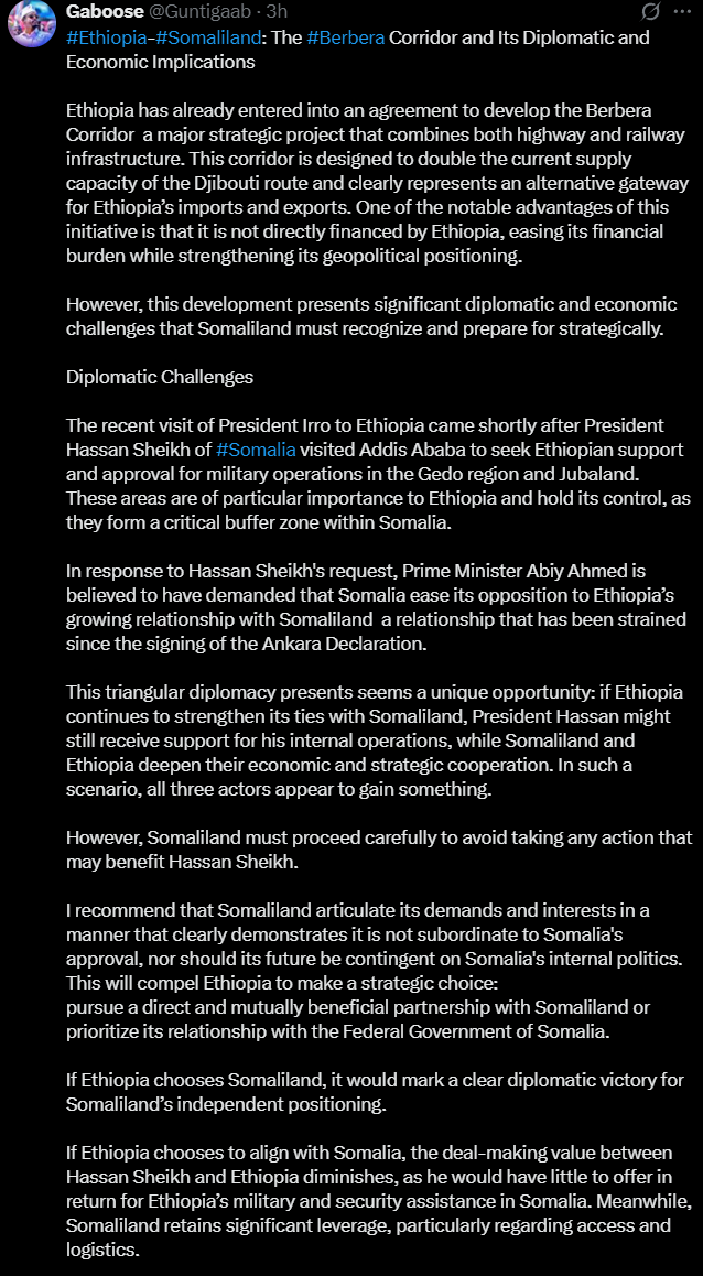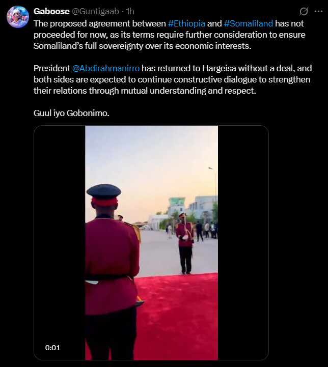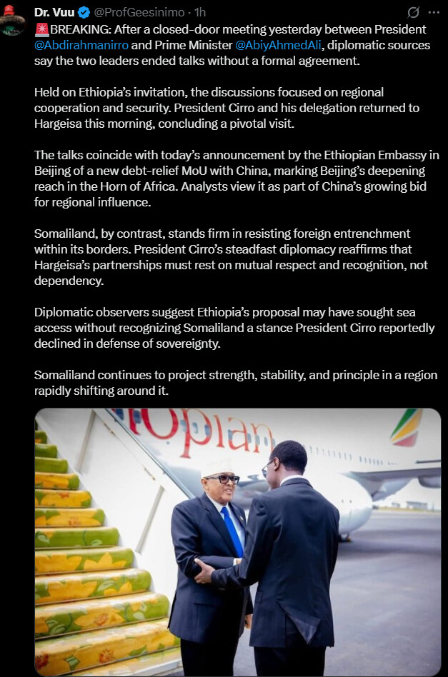 The President of the Republic of Somaliland, Dr. Abdirahman Mohamed Abdillahi (Irro), accompanied by a distinguished delegation, has arrived in Addis Ababa, the capital of the Federal Democratic Republic of Ethiopia, on an official visit at the invitation of Prime Minister Abiy Ahmed.