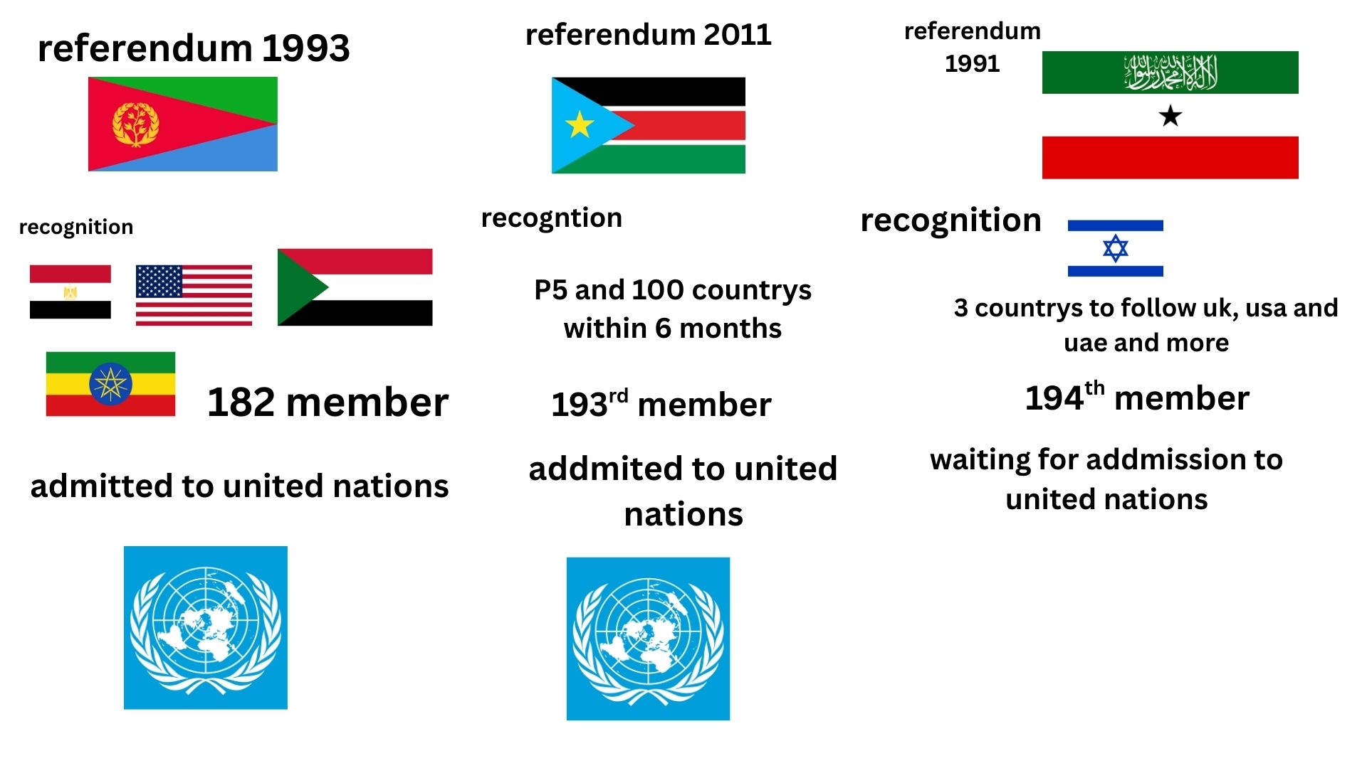 eritrea was reconized by ethiopia usa, soudan , egypt after referendum in 1993 ,and was admiited to united nations in 1993 with more countrys that followed , somaliland would become the 194th member of the united nations and key word is admitted to united nations as a nation and country , south sudan decided to leave sudan with referendum in 2011 and after votes , p5 and over 100 countrys recognised as soon as 6 months , , somaliland has some countrys such as uk that is ready to recognize somaliland and uae also ready for Somaliand recogntition and india , , somaliland would be the 194th member and addmitited into united nations, somaliland is simialr to south sudan and eritira and with exception of somalia unity claim where its meets the montevideo convention and has been a country before , somaliland was a country before and land are belongs to somaliland peoples and would likye be addmitted soon to the united nations as the 194th member with Israel diplomatic aknowlegement of the country with more to follow , somaliland could high number per month and every month in recogntion with a increase in diplomacy in somaliland ,somaliland i think should try commincate to other egions such as south eastern asia ie indoesnsia and thailand and cambodia , areas of middile east are volitile and south asia and south eastern asia are simialr areas as eatsern africa than middile eastern politics , somaliland can ask to attend south eastern asia meeting and ask for recogntion