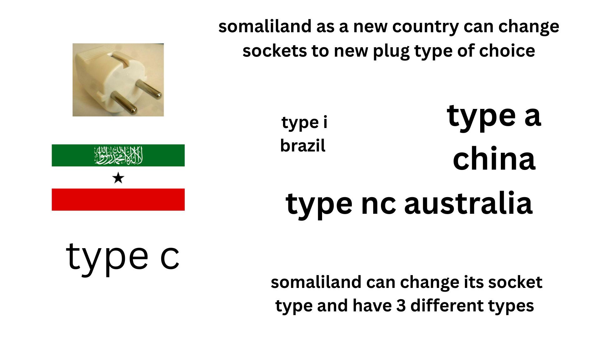 image shows world plug sockets somaliland has the c plug similar to europe and india and many countrys say many types of sockets exisit and many country countrys have different socket types and somaliland as a new country and new flotation of its currency would make 20 billion dollars and can see a change in its socket types , it can similar to australia and get the nc plug and buy from Australia , or it can be similar to china and by the a plug or it can be similar and buy from Brazil for the i plug that only brazil has the i plug , some countrys such as India has 2 types and somaliland has one the c plug and it may be possible that somaliland could have 3 types of plug and need to buy sockets or new builds such as skyscrapers have a different socket type , many different countrys have different sockets and somaliland may change for the nc type plug from Australia , it would cost a few millions to replace the c plugs towards new sockets as it has nothing to with power output it would change and make imports more easy if say somaliland bought china a plugs and items with a plug, somaliland could change per city and at a time say borama cost of new sockets stand at 18 million dollars with around 1 million changes of sockets it doesnt cost that much as its made of plastic and metal , some think that africa should have a mixture of different world plug types say eastern africa west africa and north africa having different sockets the c plug is very common in africa , and could change with more asian and south american plug sockets