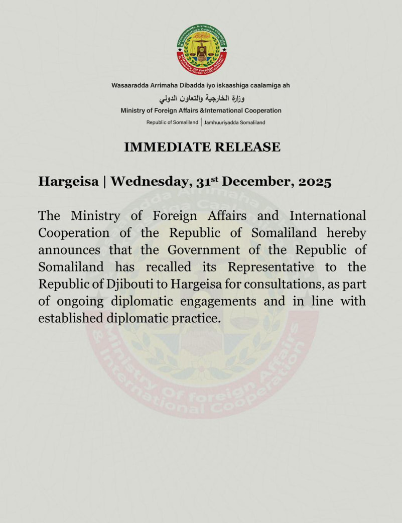 “The Government of the Republic of Somaliland has recalled its Representative to the Republic of Djibouti to Hargeisa for consultations, as part of ongoing diplomatic engagements and in line with established diplomatic practice,” the ministry said.