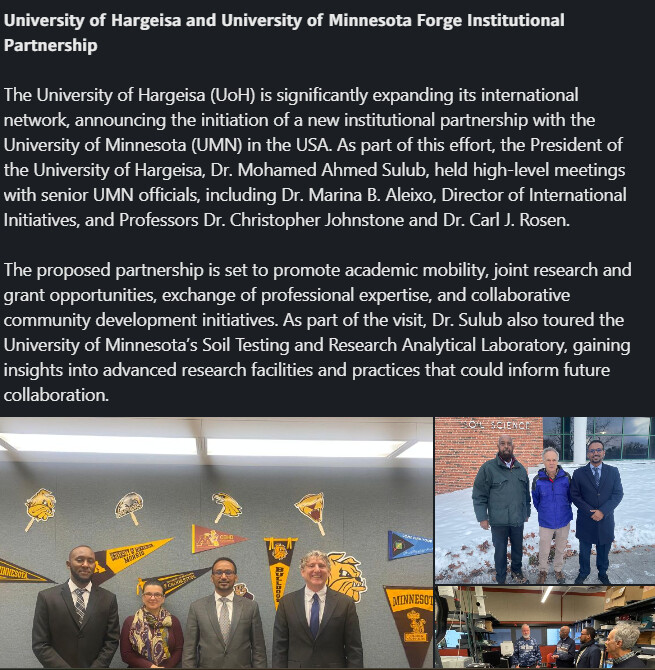 Gudoomiyaha Jaamacadda Hargeysa, Dr. Maxamed Axmed Sulub, iyo Ku-simaha Guddoomiyaha Jaamacadda Rwanda, Assoc. Prof. KAYIHURA Muganga Didas, ayaa shalay oo ay taariikhdu ahayd 22-ka May, 2025, magaalada Kigali ku saxeexay Heshiis Is-afgarad (Memorandum of Understanding - MOU). Heshiiskan muhiimka ah wuxuu ujeedkiisu yahay in xoojinta iskaashi muddo dheer ah oo ku saleysan in si siman looga wada shaqeeyo kor u qaadista awoodaha tacliimeed iyo hayadeed ee labada Jaamacadood, isla markaana laga qayb qaadato horumarinta aqoonta iyo horumarka gobolka.